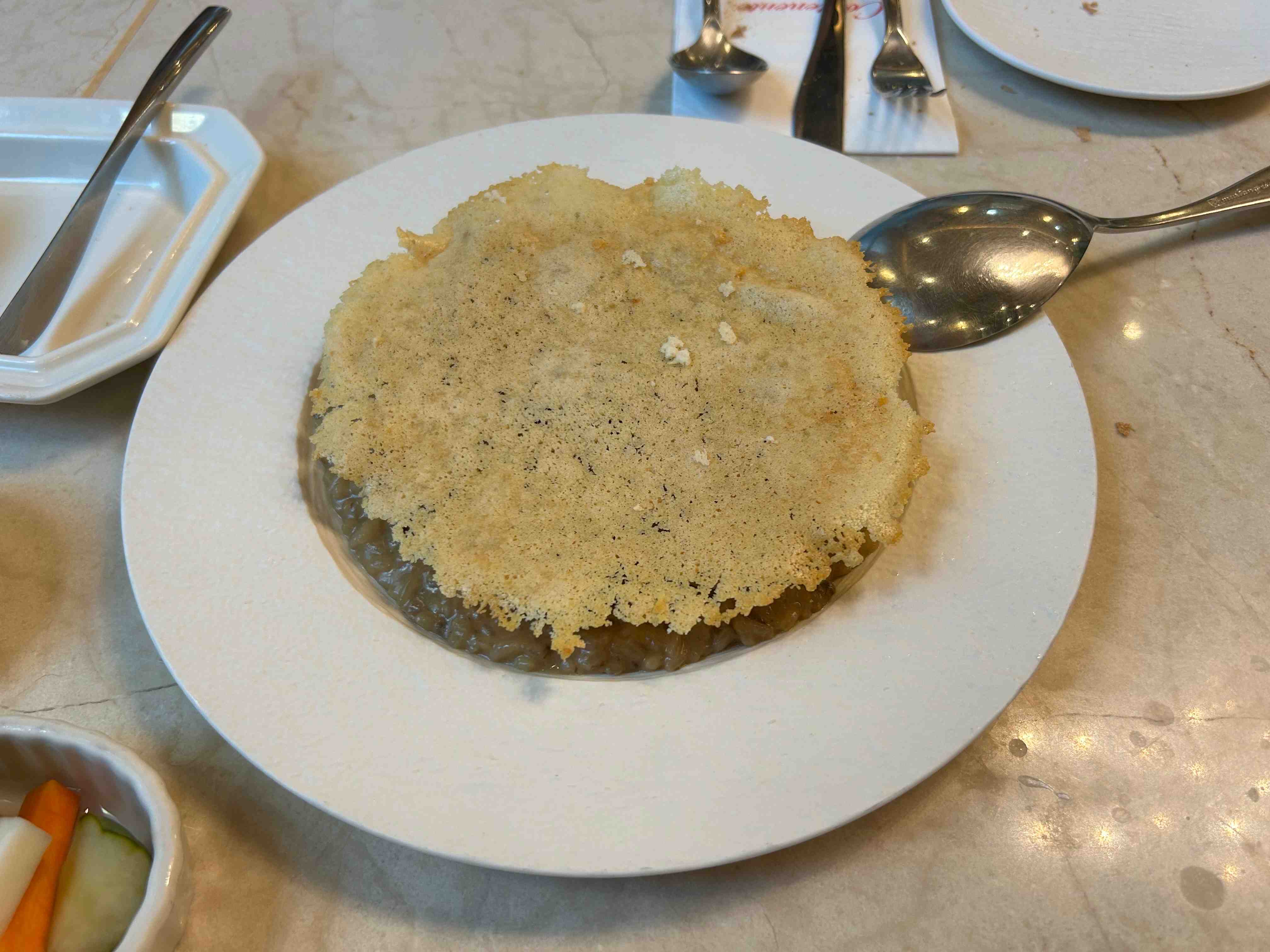 화이트 트러플 향을 더한 포르치니 리조또에 크리스피 치즈 튀일을 올린 메뉴라고 합니다.